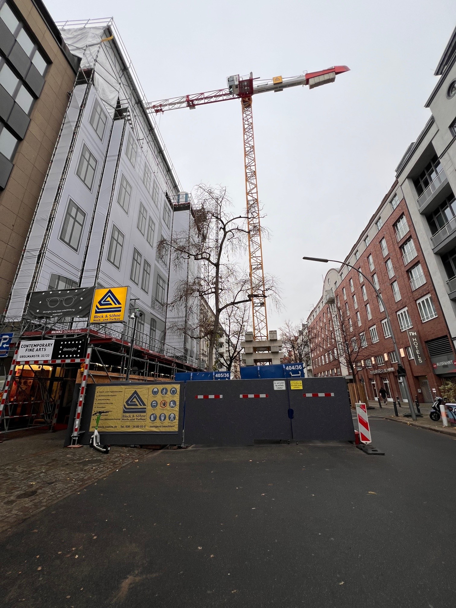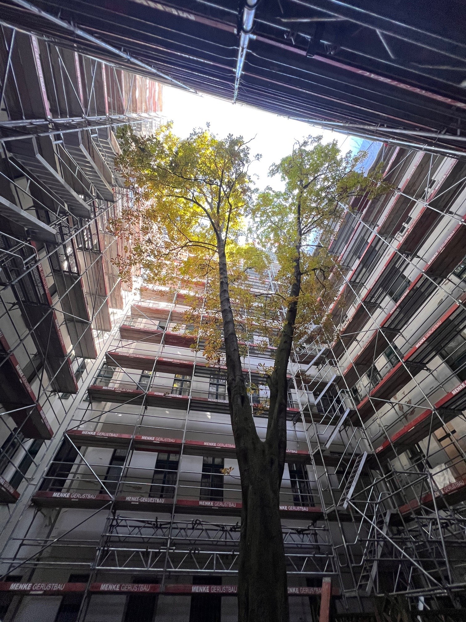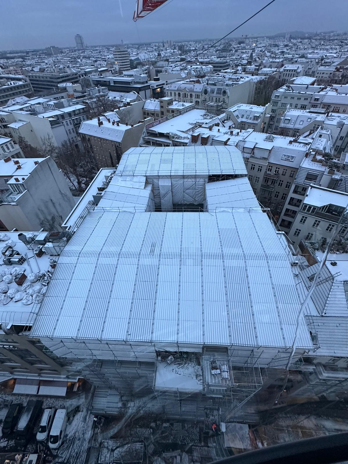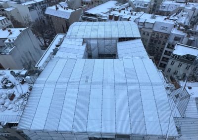 Auf dem bewohnten Gebäudeensemble Grolmanstraße 32/33 führen wir derzeit eine umfassende Sanierung und Erweiterung durch. Dazu gehören der Aufbau eines Wetterschutzdachs, der Rückbau von Dachstuhl und Dachhaut, die Erneuerung der Holzbalkendecke über dem 4. OG inklusive Schadstoffsanierung sowie der Aufbau eines neuen Geschosses in Stahl- und Holzbauweise.