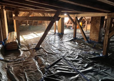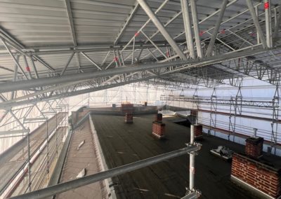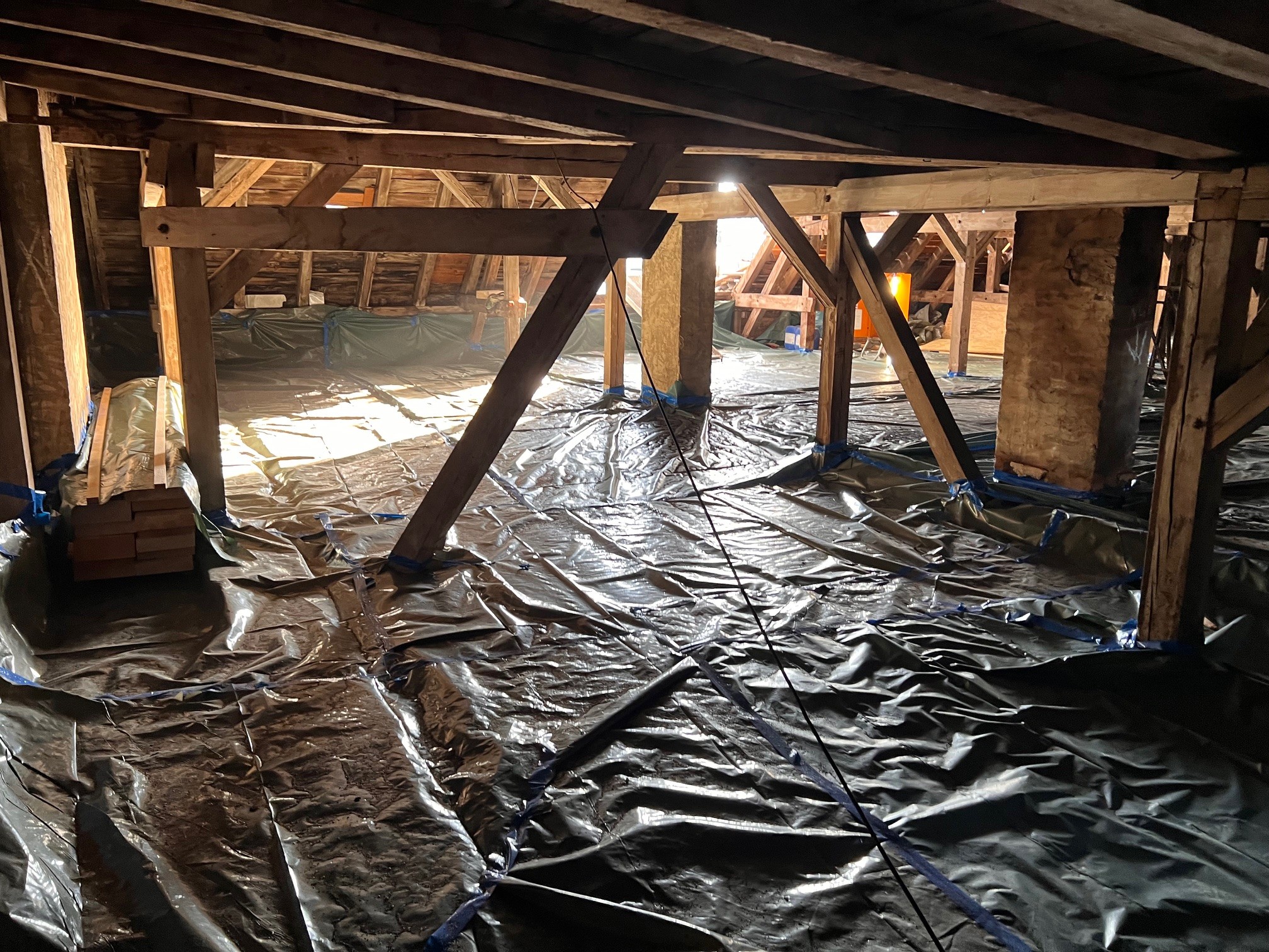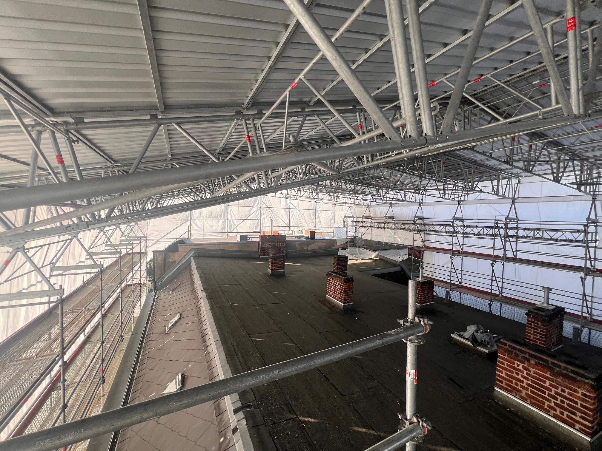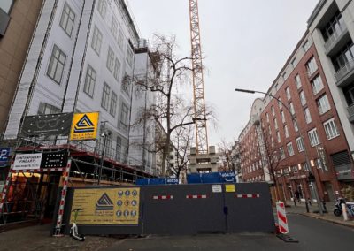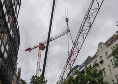 Auf dem bewohnten Gebäudeensemble Grolmanstraße 32/33 führen wir derzeit eine umfassende Sanierung und Erweiterung durch. Dazu gehören der Aufbau eines Wetterschutzdachs, der Rückbau von Dachstuhl und Dachhaut, die Erneuerung der Holzbalkendecke über dem 4. OG inklusive Schadstoffsanierung sowie der Aufbau eines neuen Geschosses in Stahl- und Holzbauweise.