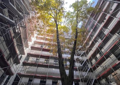 Weitere Maßnahmen umfassen den teilweisen Umbau des 1. OG, den Einbau neuer Lichtschächte und Aufzugsunterfahrten im Innenhof, die Abdichtung der Kellerwände bis zu den Fundamenten sowie die Herstellung von Einzelfundamenten für die neuen Balkone.